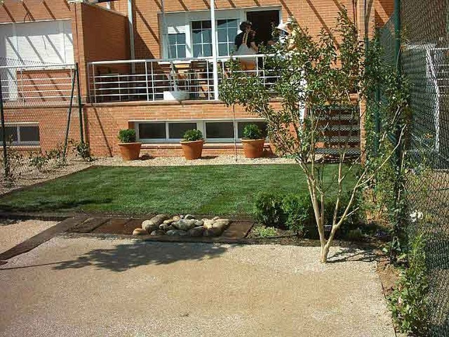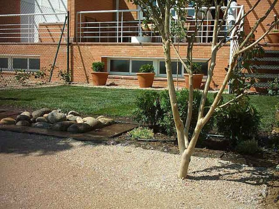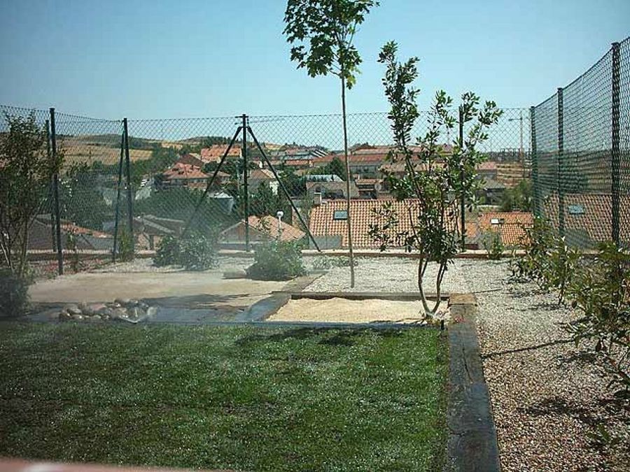 En los límites, los arbustos y trepadoras (que irán creciendo) sirven para independizarse del entorno. El resto son arbolillos y arbustos ornamentales: lagerstroemia indica (júpiter), arbutus unedo (madroño), pitosporo enano... Entre los dos espacios de césped y jabre, se ha creado específicamente para la niña un arenero con un madroño.