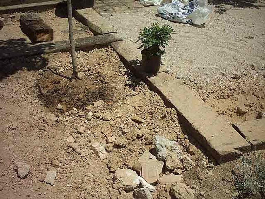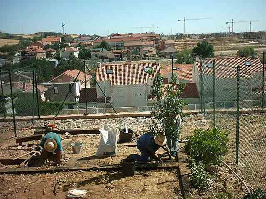 A la hora de ponerse manos a la obra con el jardín, la zona se rellena con cascotes de obra, por lo que se suministra una parte importante de sustrato. En las imágenes se puede apreciar el trabajo de instalación de las traviesas de madera, así como la aplicación de cascotes, tierra y algunos ejemplares que formarán parte de la vegetación.