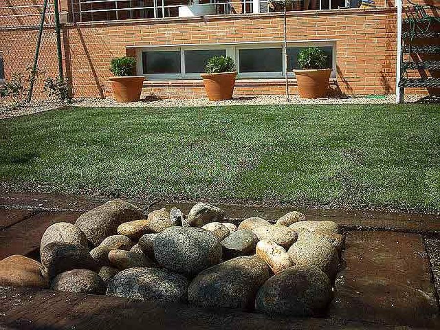 Un elemento fundamental, en torno al que se articulan el resto de zonas del jardín, es la fuente de piedras. Es un detalle original que no sólo sirve para humedecer el ambiente, sino que, en conjunto con el resto de componentes (áreas, traviesas, grava, césped), le otorga al espacio un aire zen que nos transporta a lugares plácidos y relajantes.