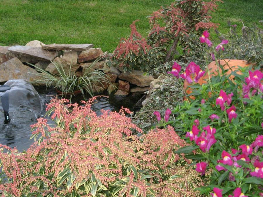 El estanque se ha convertido en la pieza central del jardín de María José: "ocupa un lugar especial ya que se puede contemplar desde el salón. En él viven once carpas, incluso dos nacieron allí. Su estructura es una rocalla con bacopas, hederas, dos preciosos pieris, una azalea, iris, además de antirrinos, violas y lobelias". Desde luego, un elemento imprescindible que hace de este jardín un espacio privilegiado para los sentidos.