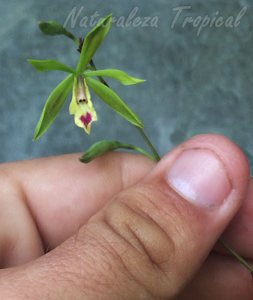 Las flores se disponen en inflorescencias terminales que desarrollan tallos florales de +/- 45 cm de largo. El tallo floral puede albergar de 5-20 flores pequeñas (+/- 4 cm de diámetro) que irán abriendo poco a poco. Cada flor presenta los pétalos y sépalos lineares-lanceolados de similares tallas, amarillos, marrones o verdes y con los márgenes enteros. El labelo presenta 3 lóbulos (dos laterales a ambos lados de la columna y uno al final de esta), es abierto (los lóbulos laterales no envuelven la columna) y con el lóbulo extremo linear-lanceolado; la coloración es blanca-amarillenta con una mancha central púrpura. En el interior de los lóbulos laterales del labelo también se aprecian nerviaciones púrpuras.