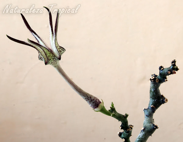Vista de la flor típica de la flor y parte del tallo de la planta suculenta Ceropegia stapeliiformis