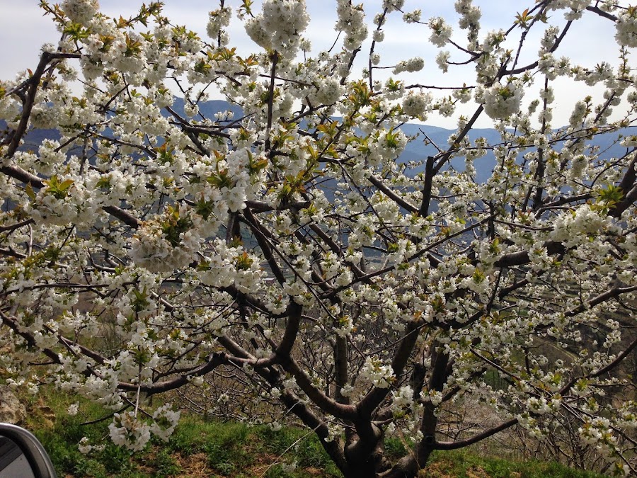 Este año por Semana Santa las cerezas no florecen a toda la fuerza, parece a la niebla blanca sobre las cuestas. Pero está claro que en una semana será posible admirarse por el florecimiento completo.